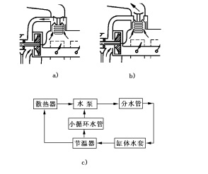 發(fā)動(dòng)機(jī)的水循環(huán)路線如圖16所示,發(fā)動(dòng)機(jī)溫度較低時(shí)(低于83℃左右,不同發(fā)動(dòng)機(jī)數(shù)據(jù)有差異),主閥門關(guān)閉(圖16-a),旁通閥門開(kāi)放,冷卻水只能經(jīng)小循環(huán)水管直接流回水泵的進(jìn)水口,然后又被水泵壓入分水管進(jìn)入水套。此時(shí),水不流經(jīng)散熱器,稱小循環(huán)(圖16-c)。水流路線是:節(jié)溫器→小循環(huán)水管→水泵→分水管→缸體水套→節(jié)溫器。